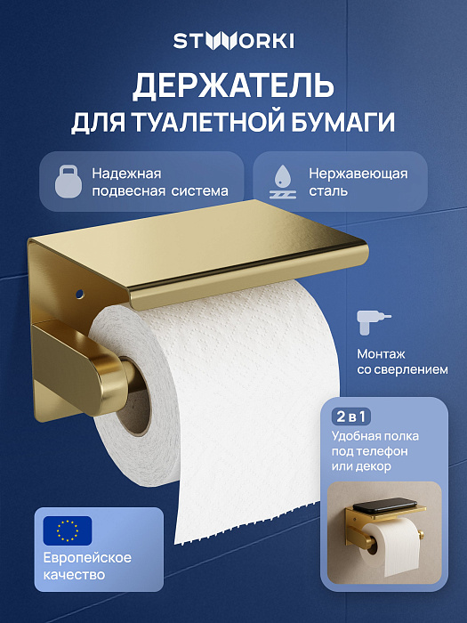 Держатель для туалетной бумаги STWORKI Эстерсунд S31345GM с полкой для телефона, матовое золото