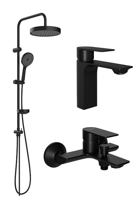 Комплект для ванной Смеситель STWORKI Гриндстед S29010BK черный + Стойка Монтре S30180BK матовая черная + Смеситель S29100BK матовый черный