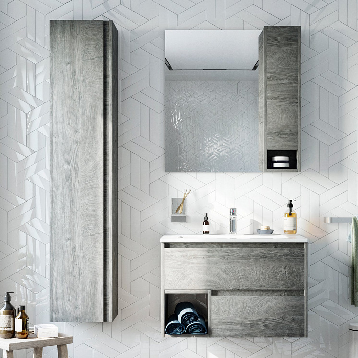 Мебель для ванной комнаты STWORKI Карлстад 90 дуб рошелье, в стиле лофт, серая (комплект, гарнитур)