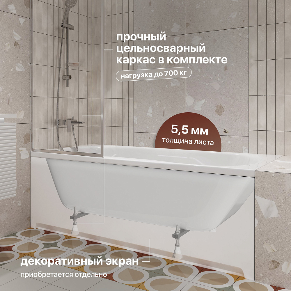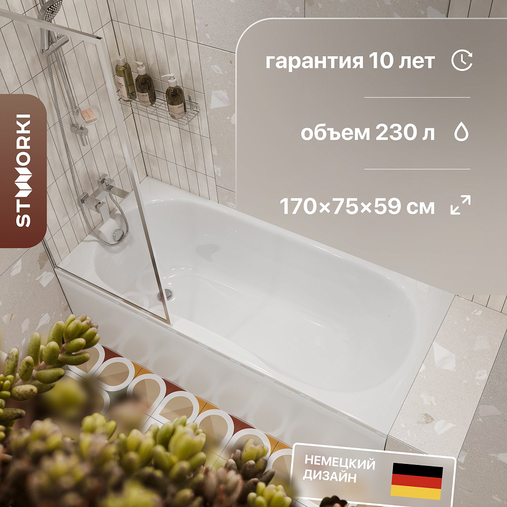 Акриловая ванна STWORKI Хальмстад 170x75 см, пристенная, белая, с каркасом
