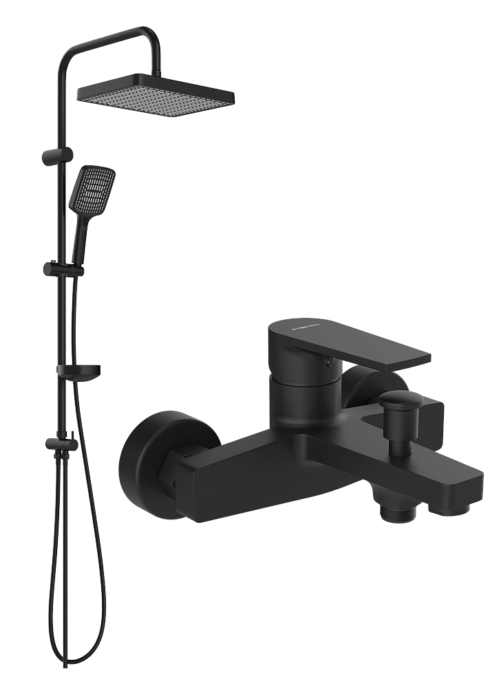 Душевой комплект Смеситель STWORKI Берген S21100BK, матовый черный + Стойка Хадстен S17180BK, матовая черная