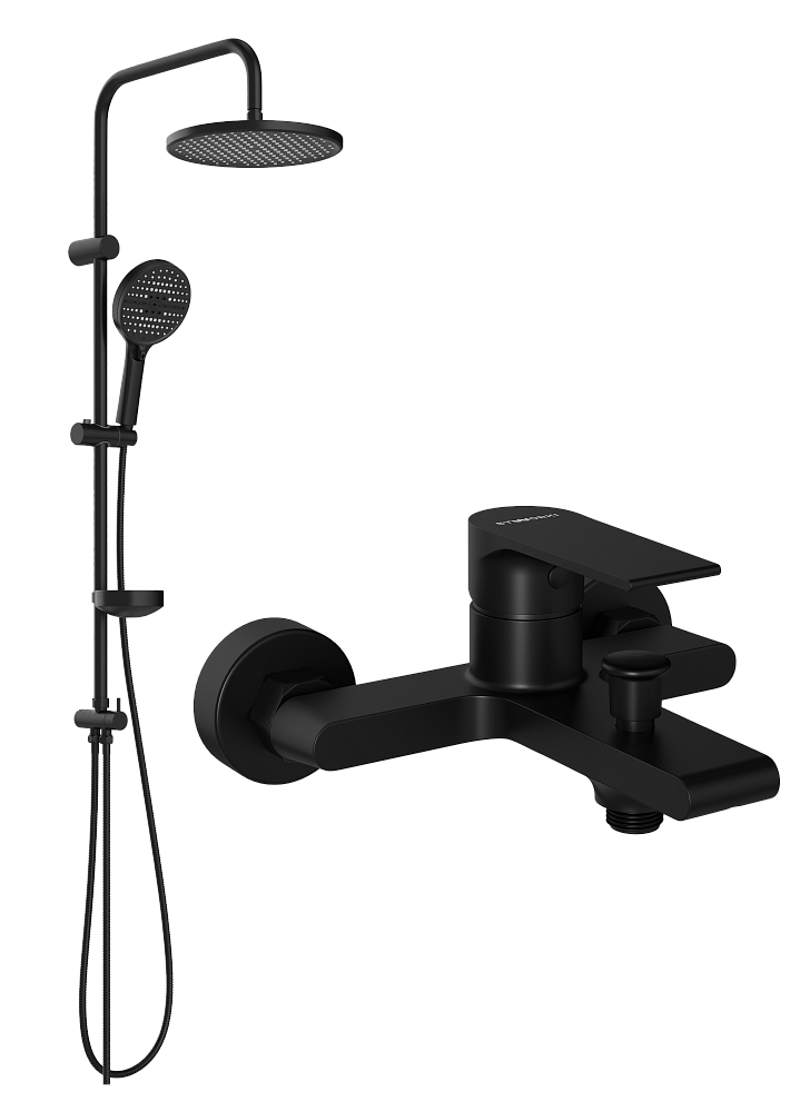 Душевой комплект Смеситель STWORKI Колдинг S32100BK, матовый черный + Стойка Хальмстад S15180BK, матовая черная