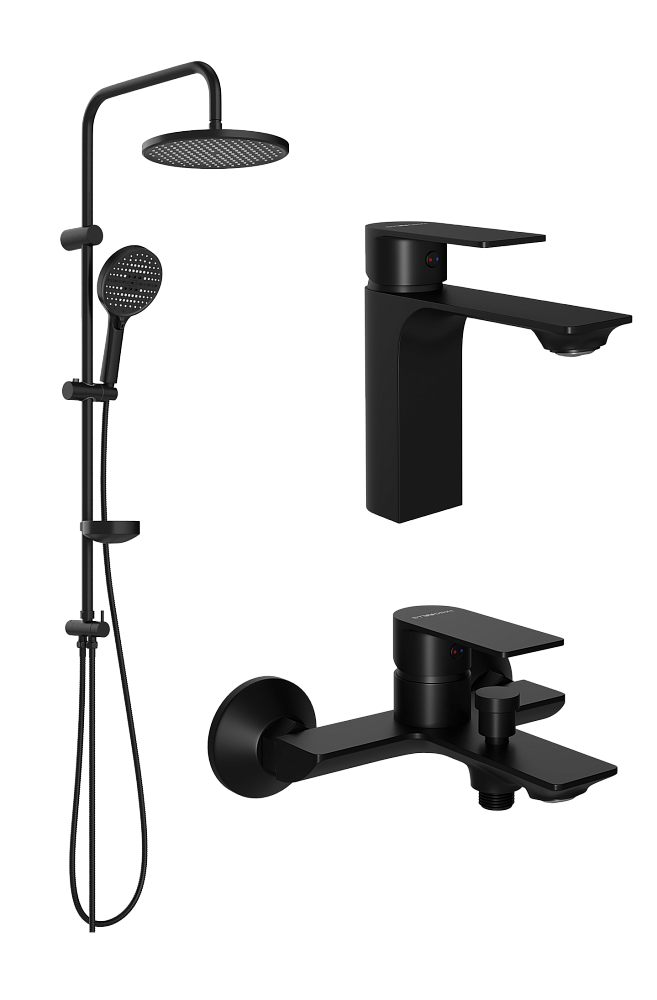 Комплект для ванной Смеситель STWORKI Гриндстед S29010BK черный + Стойка Хальмстад S15180BK матовая черная + Смеситель S29100BK матовый черный