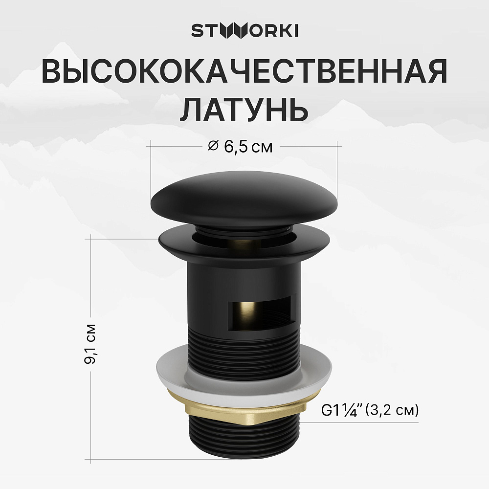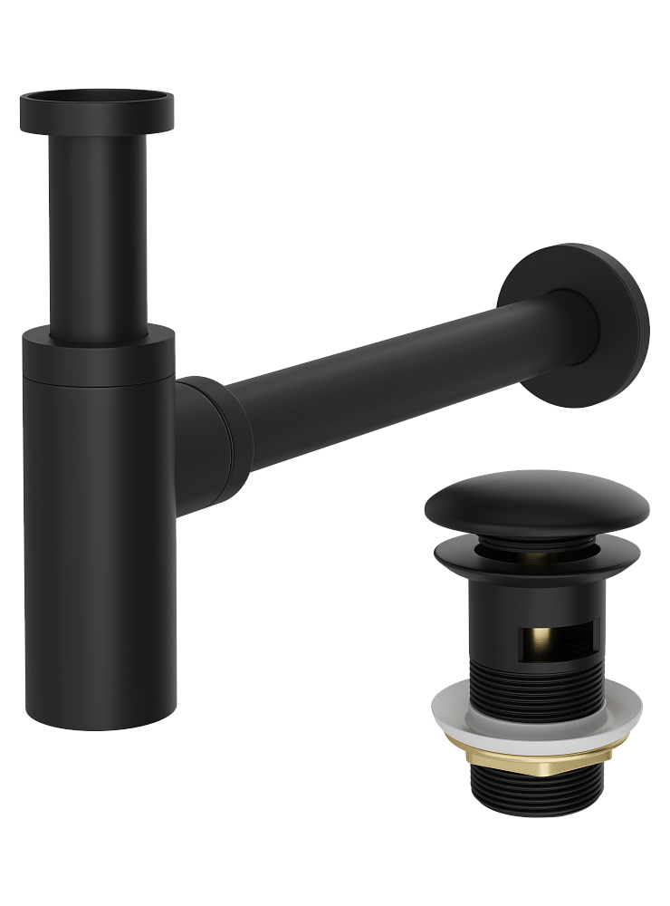 Комплект Донный клапан STWORKI SW-001BK с переливом, матовый черный + Сифон SD-001BK 32 мм, бутылочный, матовый черный