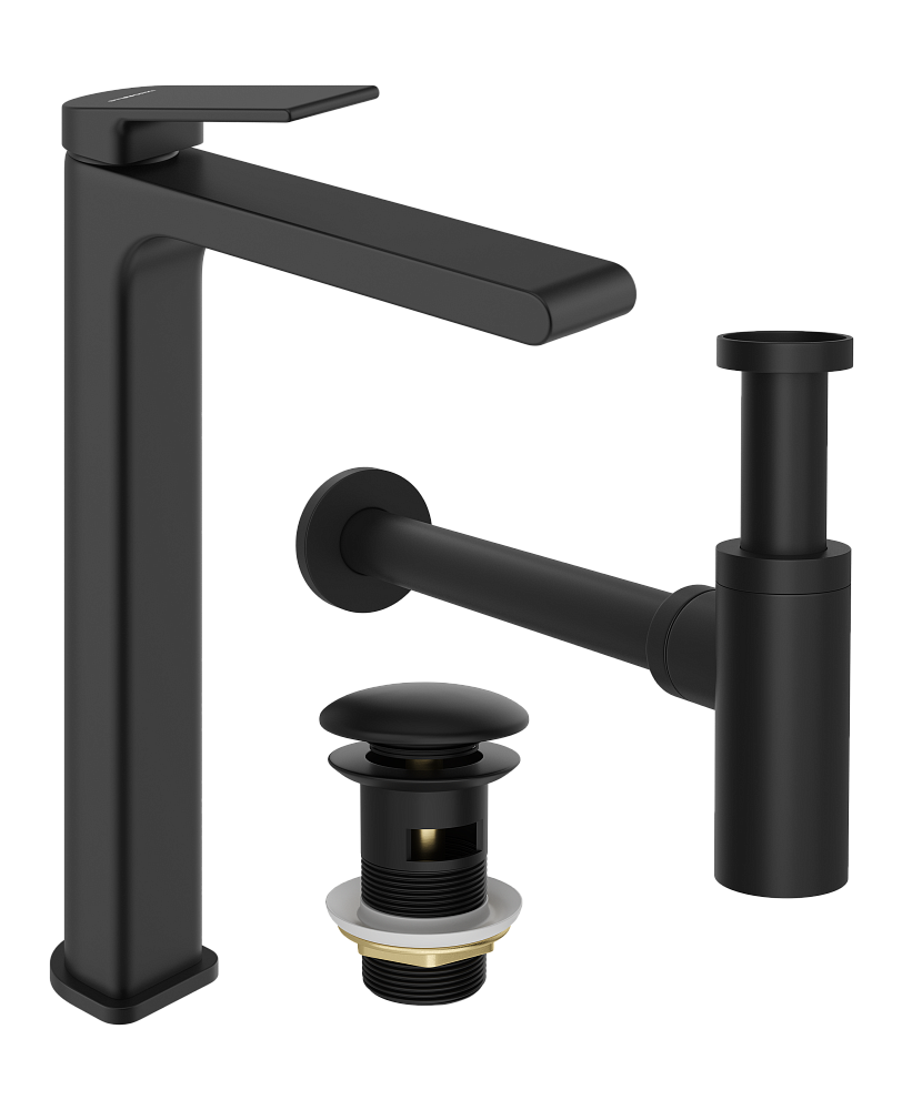 Комплект Смеситель STWORKI Ольборг S20020BK + Сифон SD-001BK + Донный клапан SW-001BK