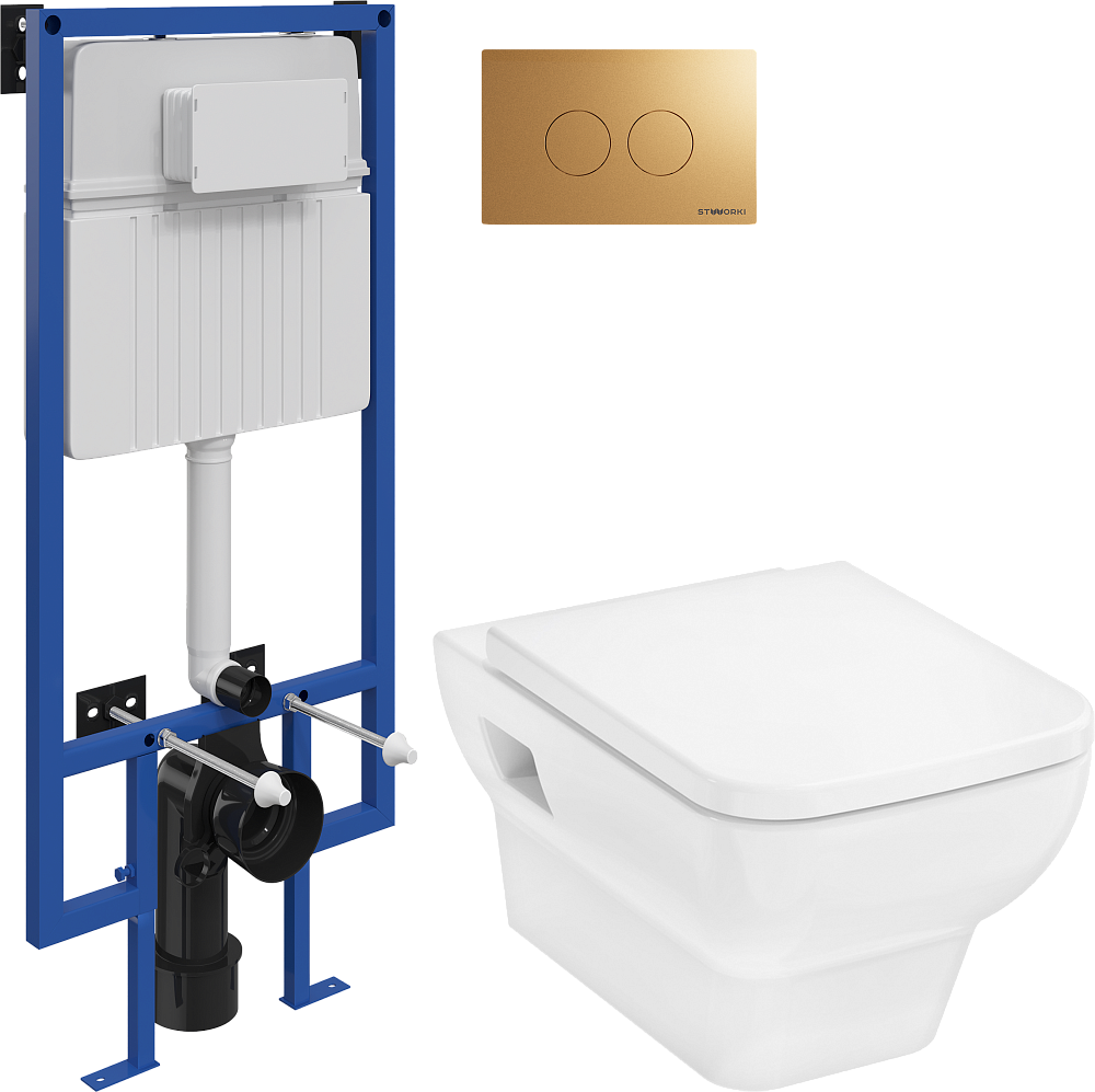 Комплект 3 в 1 Унитаз подвесной Hansgrohe CreekTide Q HGSET001 + Инсталляция STWORKI 510162 + Кнопка Хельсинки 500474 цвет матовое золото