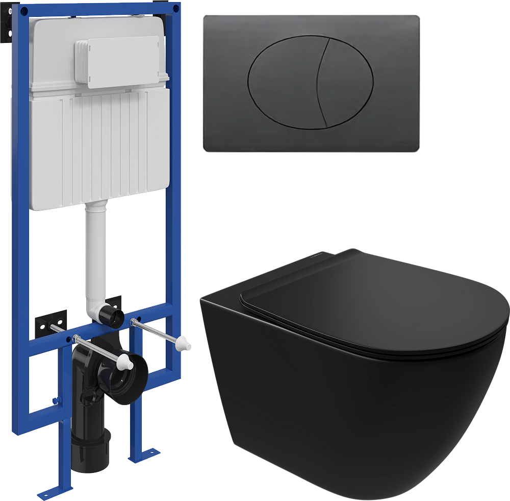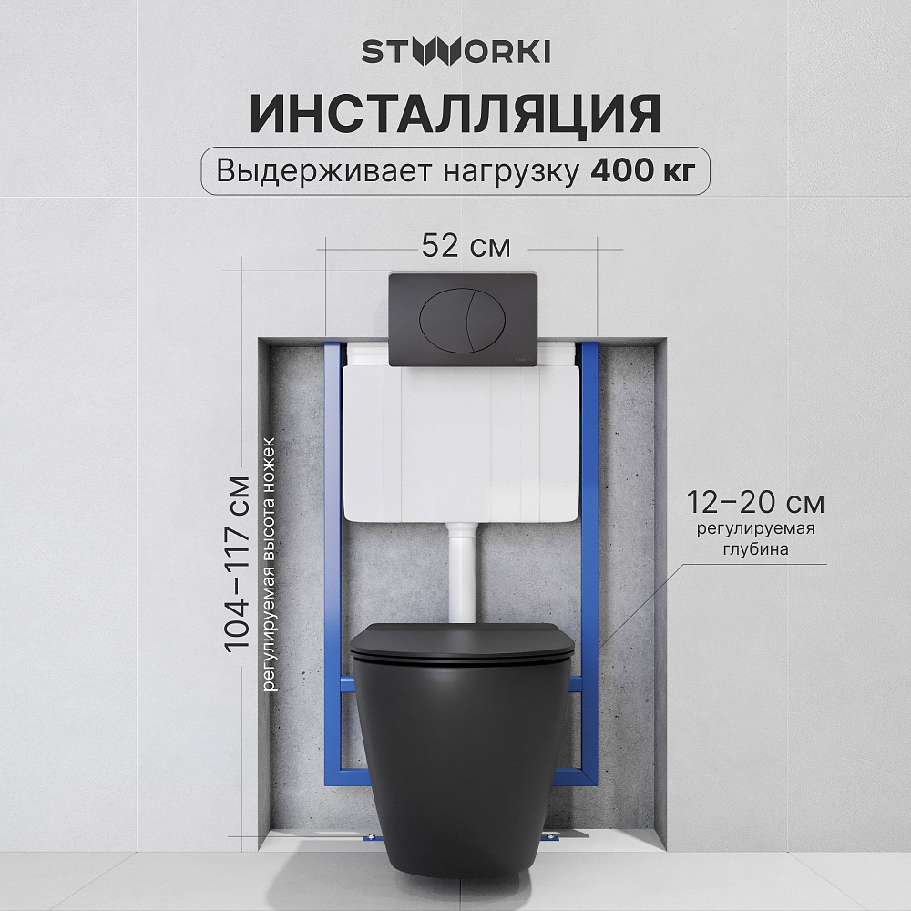 Комплект 3 в 1 Унитаз подвесной STWORKI Готланд S13401BK, безободковый, с микролифтом, глянцевый черный, антивсплеск + Инсталляция 510162 + Кнопка 230858 цвет матовый черный