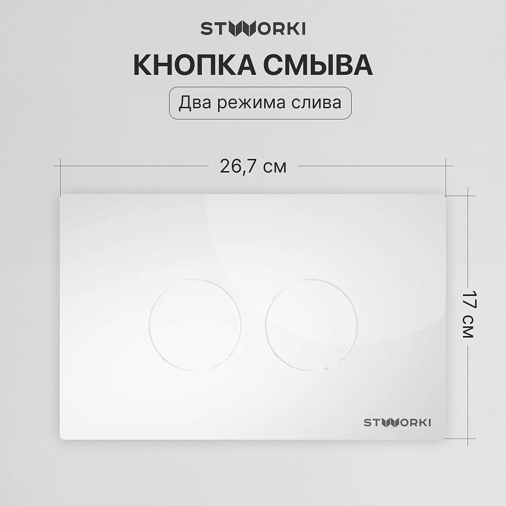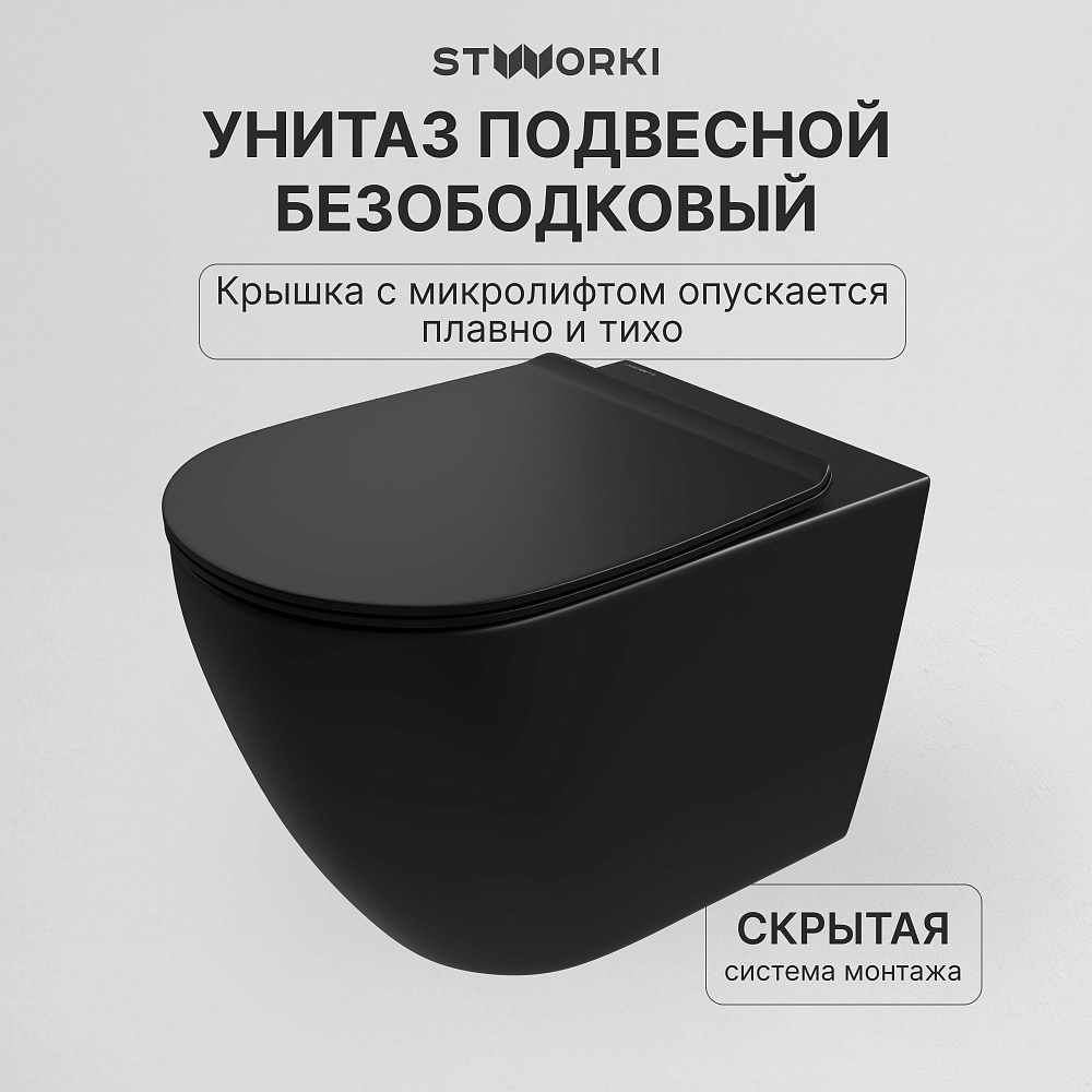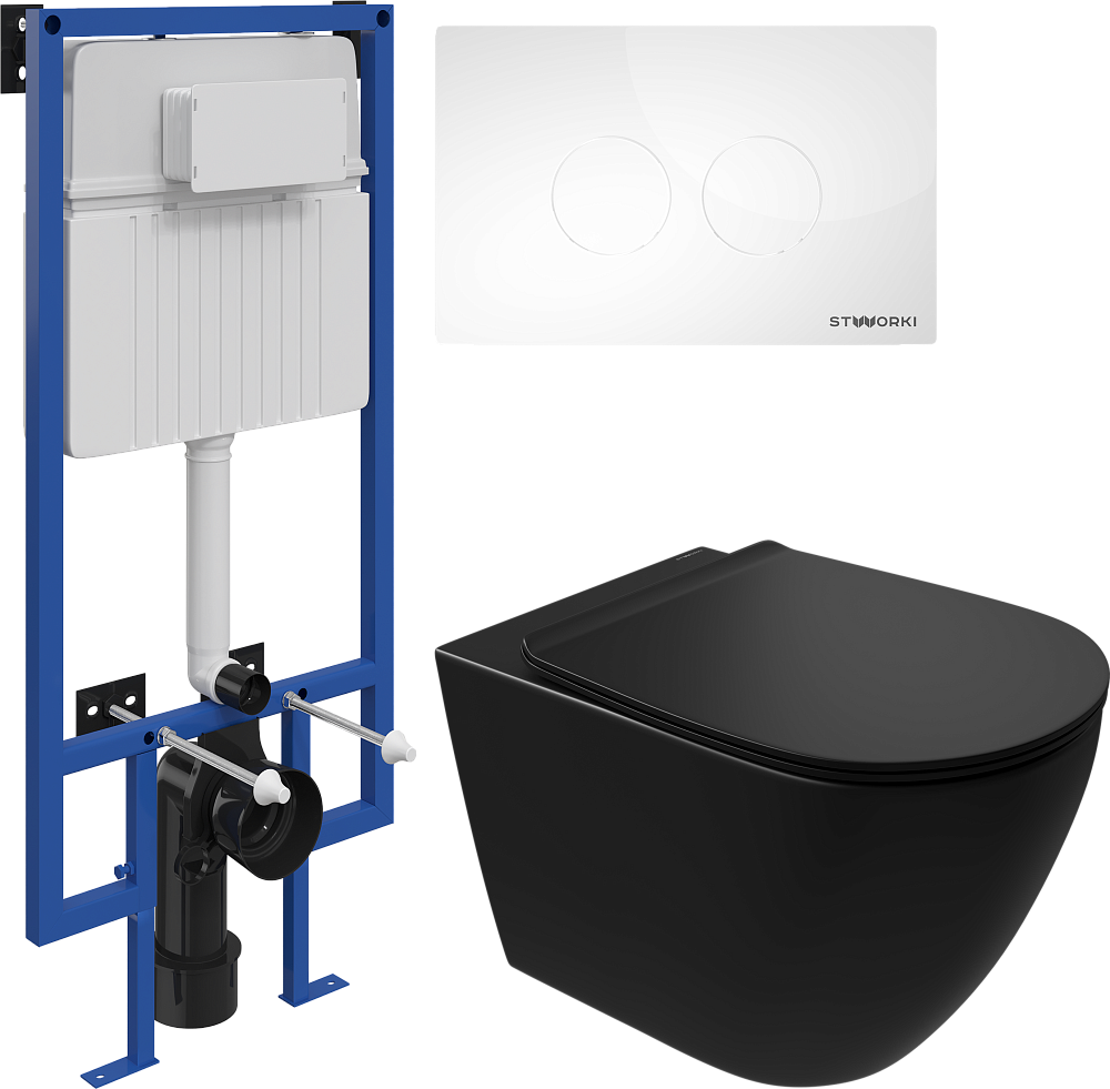 Комплект 3 в 1 Унитаз подвесной STWORKI Готланд S13401BK, безободковый, с микролифтом, глянцевый черный, антивсплеск + Инсталляция 510162 + Кнопка Хельсинки 500470 цвет глянцевый белый