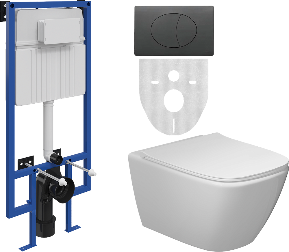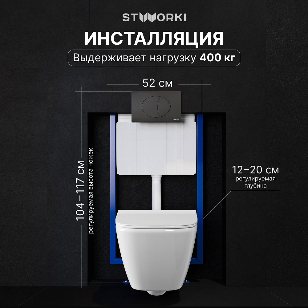 Комплект 4 в 1 Унитаз подвесной STWORKI Карлстад 5610, безободковый + Сиденье Lento 0405, быстросъемное, с микролифтом + Инсталляция 510162 + Кнопка 230858 цвет матовый черный