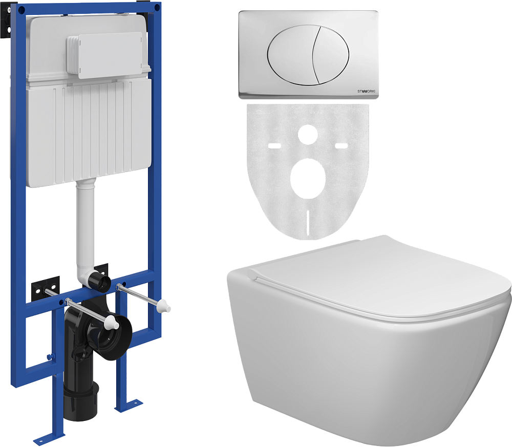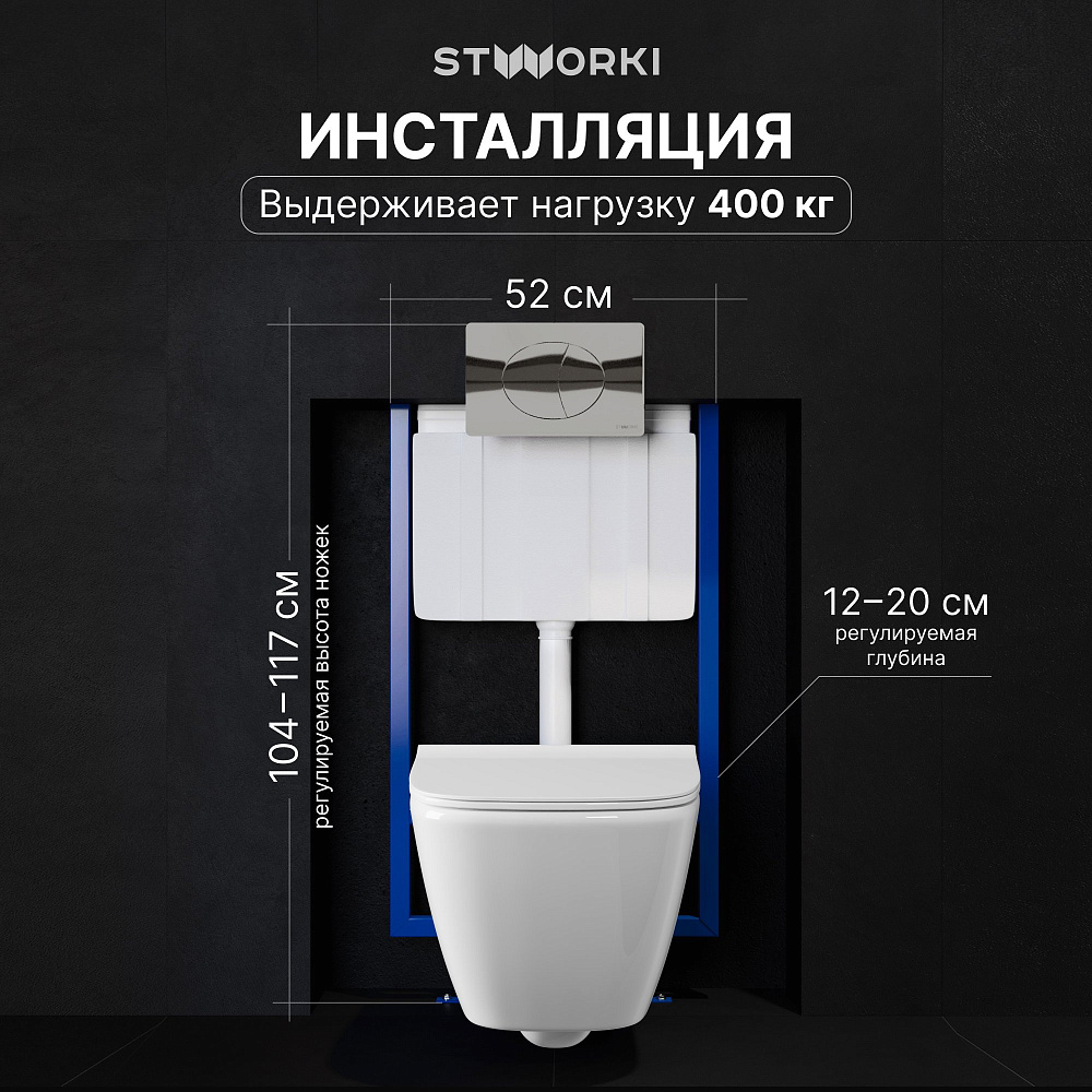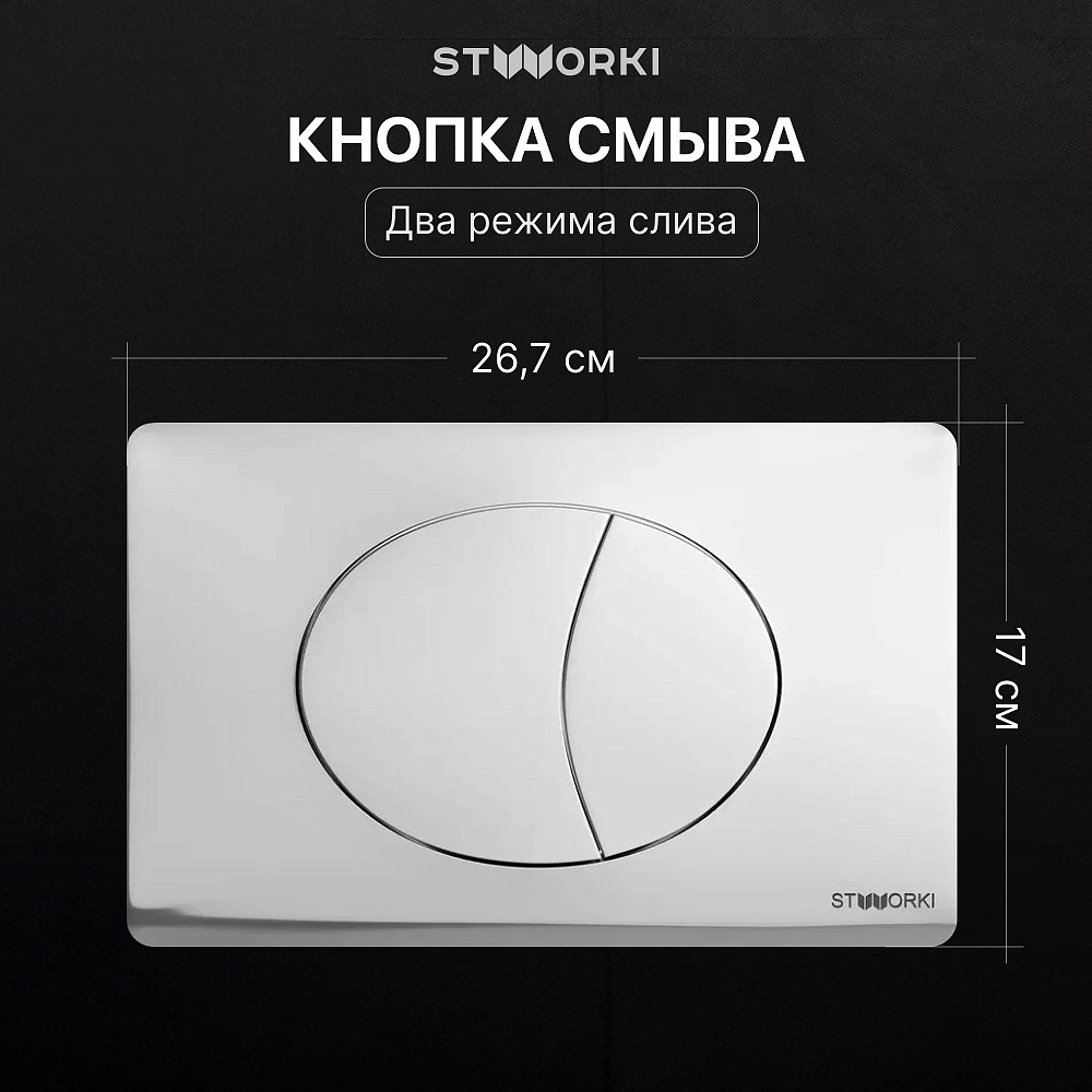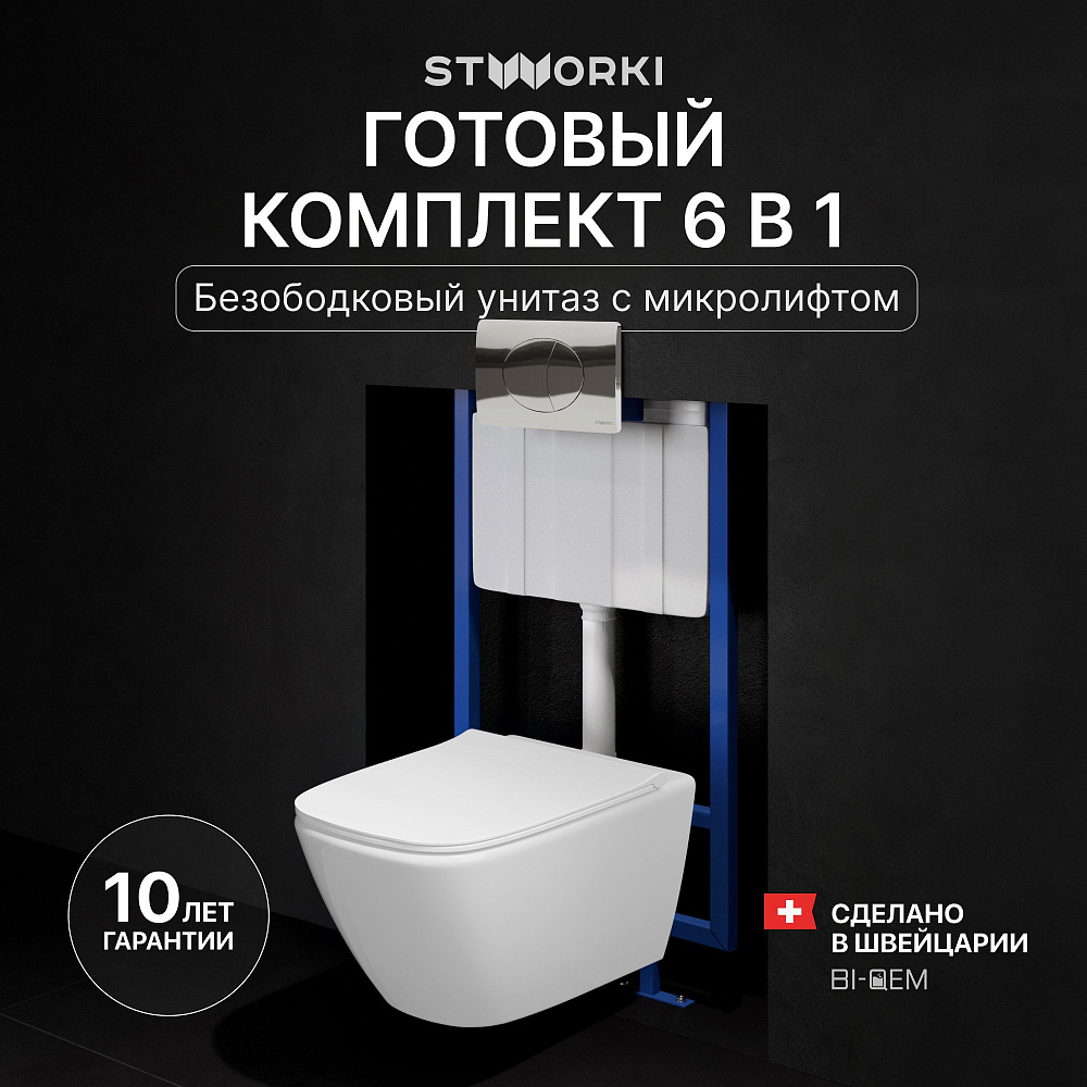 Комплект 4 в 1 Унитаз подвесной STWORKI Карлстад 5610, безободковый + Сиденье Lento 0405, быстросъемное, с микролифтом + Инсталляция 510162 + Кнопка 230822 цвет глянцевый хром