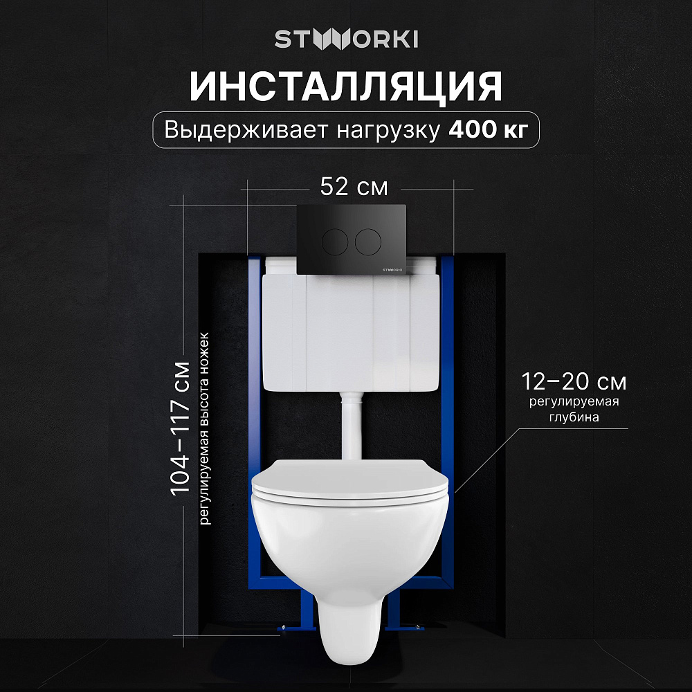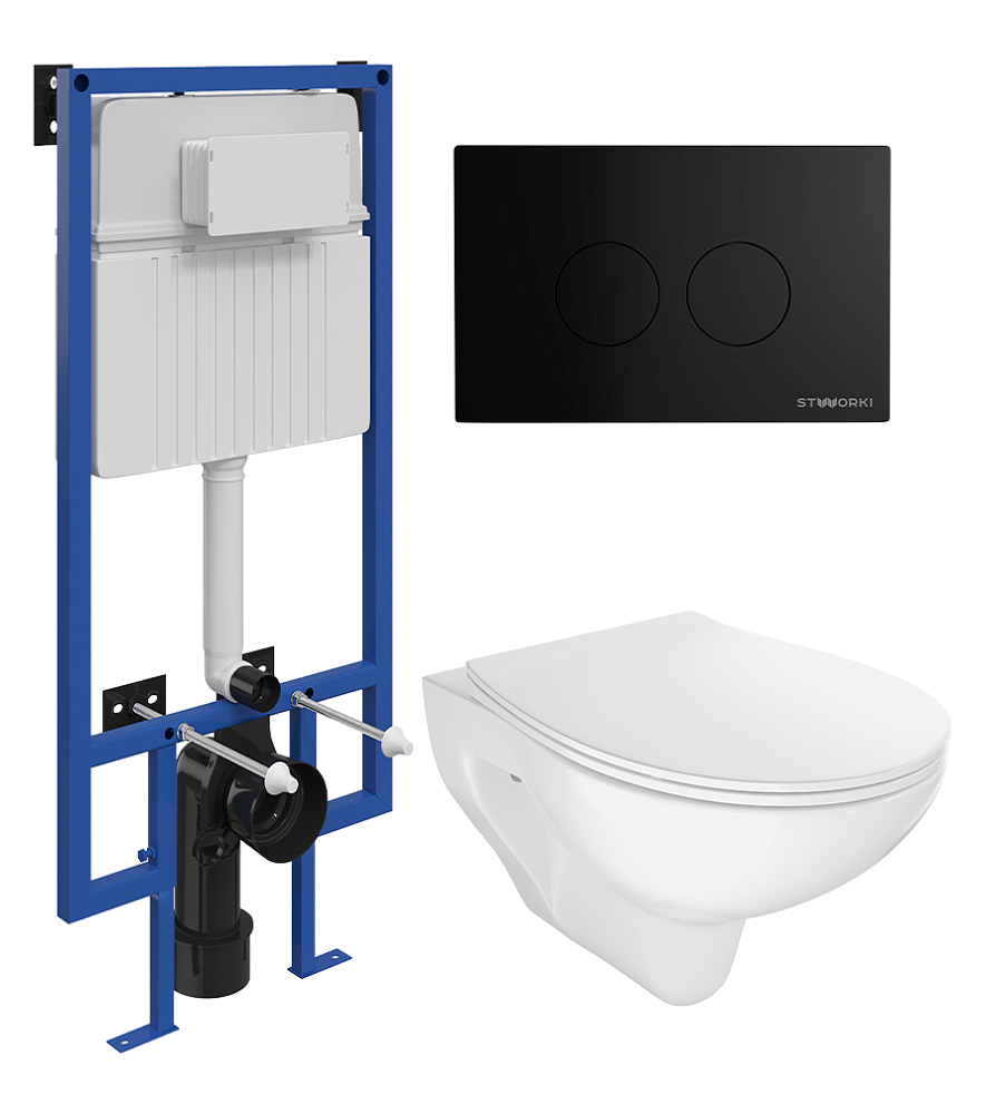Комплект 4 в 1 Унитаз подвесной STWORKI Хедмарк 3510, безободковый + Сиденье Smart 0302, быстросъемное, с микролифтом + Инсталляция 510162 + Кнопка Хельсинки 500471 цвет матовый черный