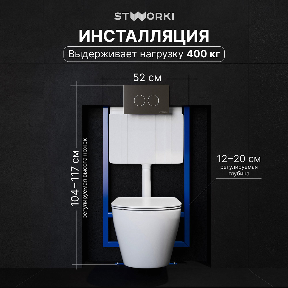 Комплект 4 в 1 Унитаз подвесной STWORKI Молде 7551N003-7700, безободковый + Сиденье 801-003-019, с микролифтом + Инсталляция 510162 + Кнопка Хельсинки 500472 цвет глянцевый хром