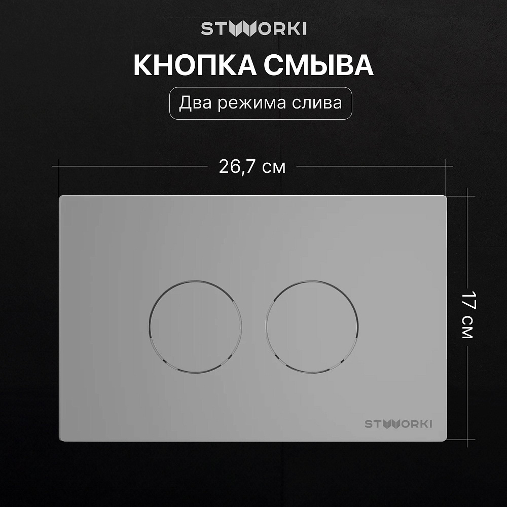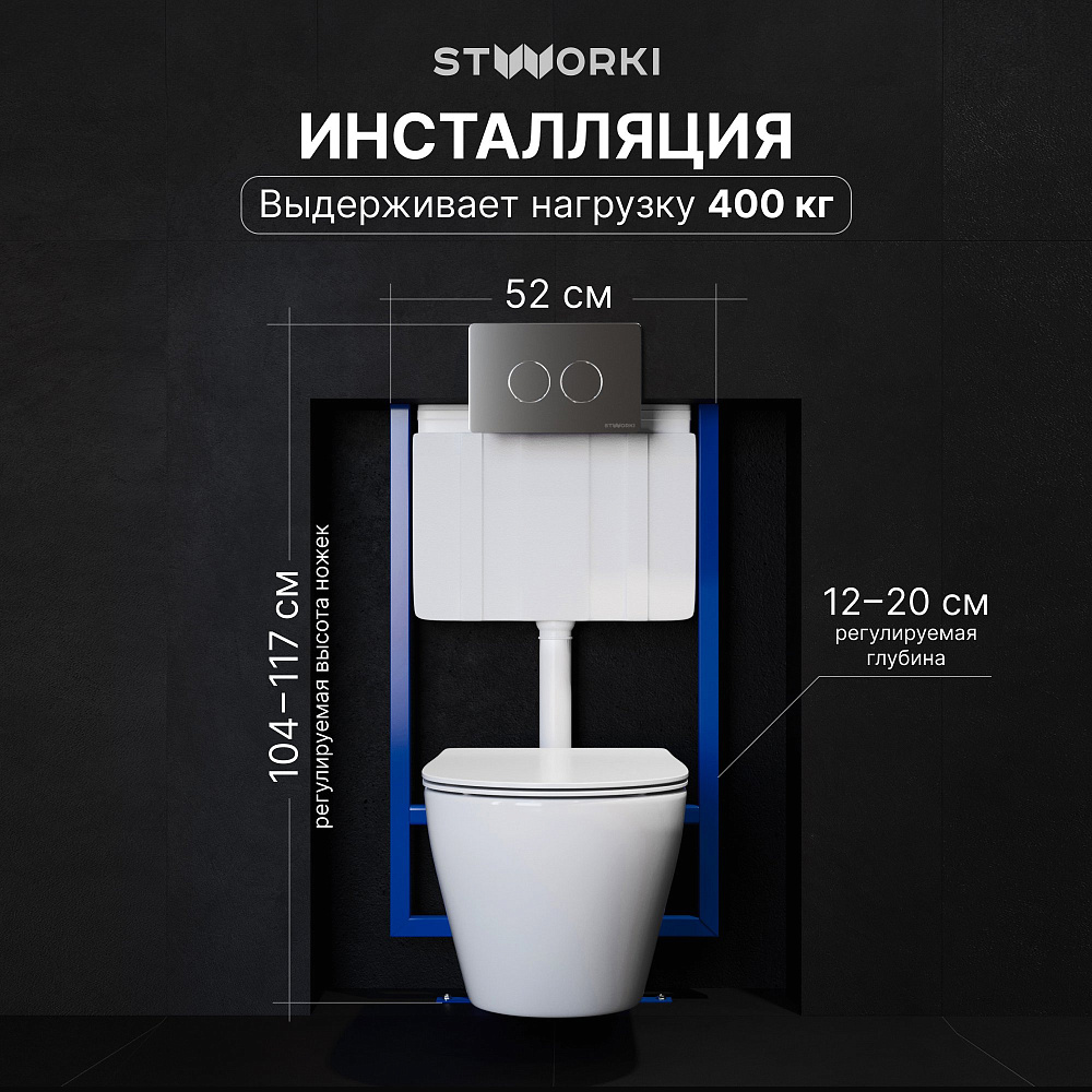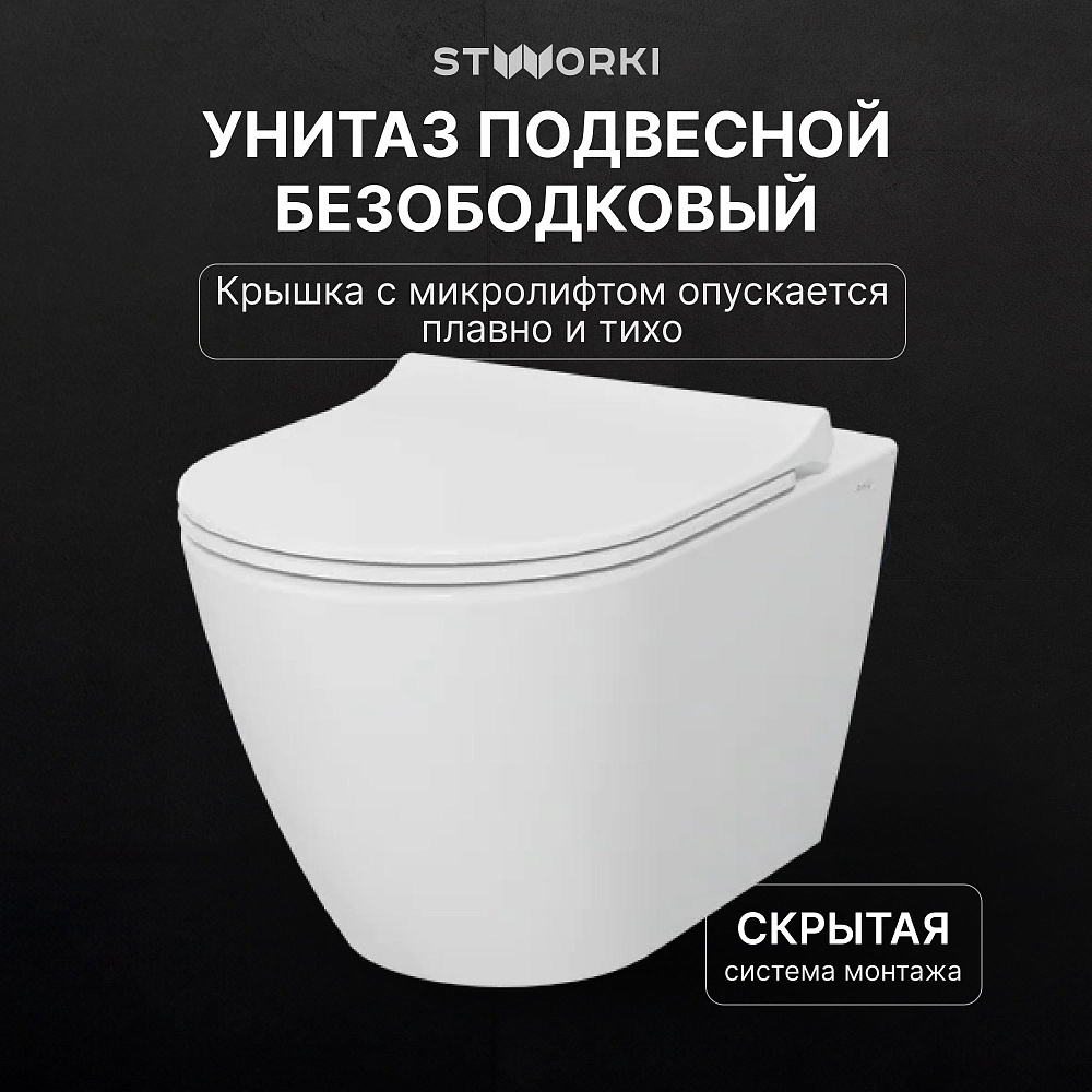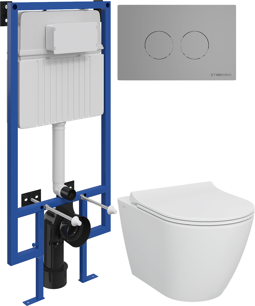 Комплект 4 в 1 Унитаз подвесной STWORKI Молде 7551N003-7700, безободковый + Сиденье 801-003-019, с микролифтом + Инсталляция 510162 + Кнопка Хельсинки 500473 цвет матовый хром