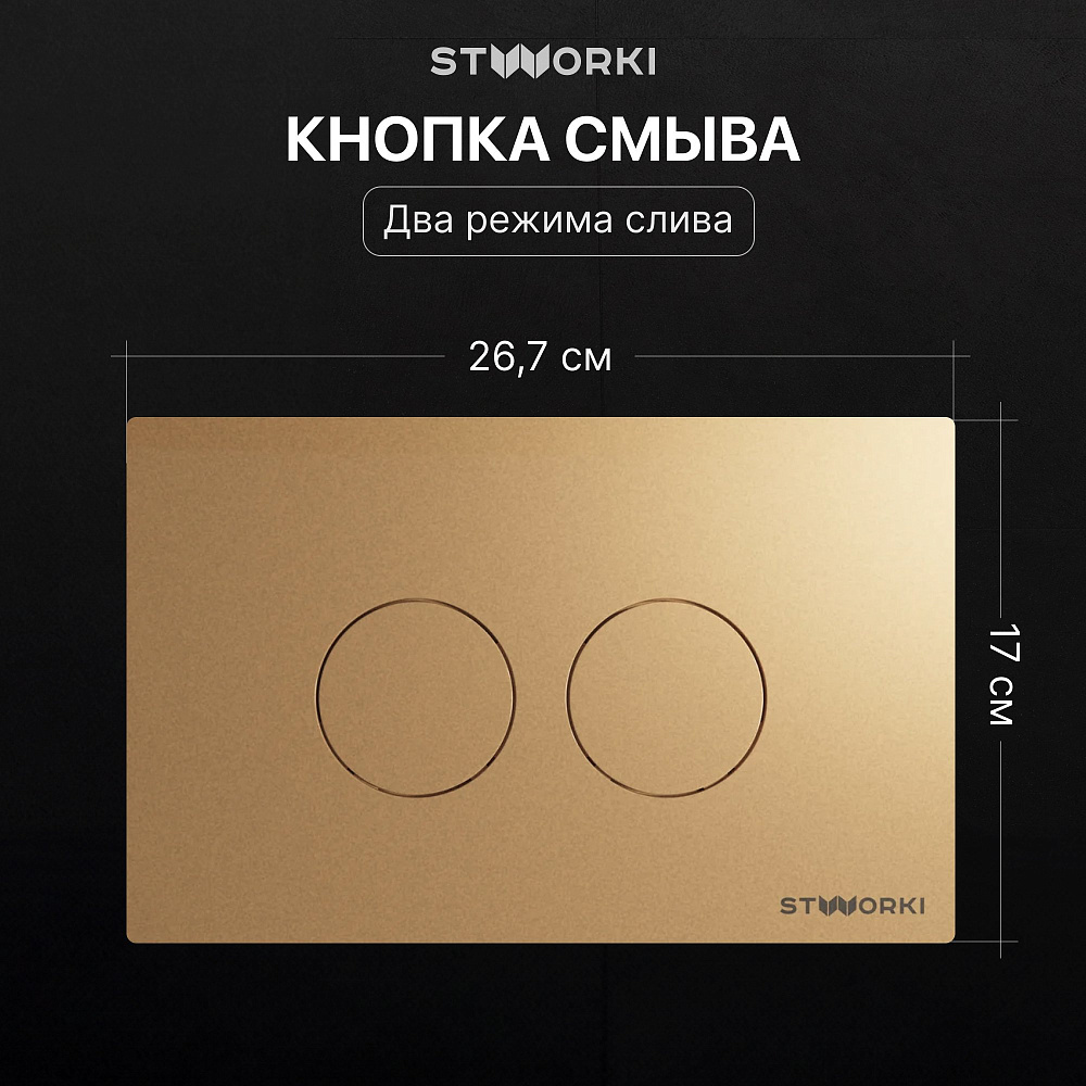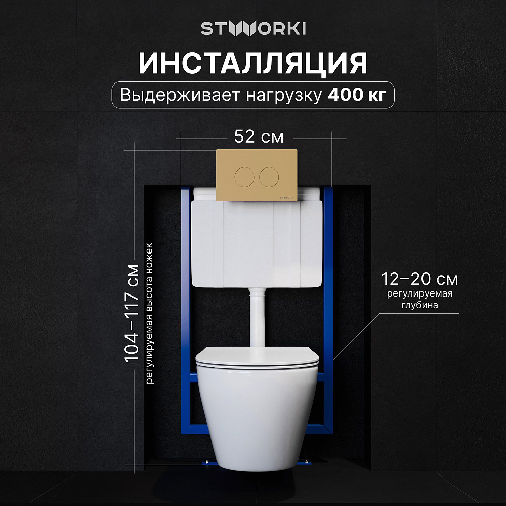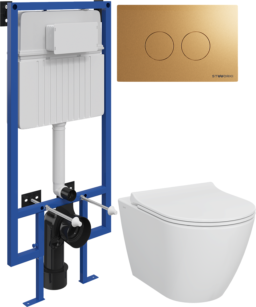 Комплект 4 в 1 Унитаз подвесной STWORKI Молде 7551N003-7700, безободковый + Сиденье 801-003-019, с микролифтом + Инсталляция 510162 + Кнопка Хельсинки 500474 цвет матовое золото