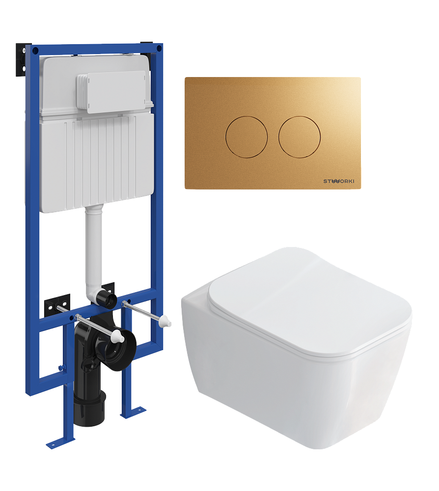 Комплект 3 в 1 Унитаз подвесной STWORKI Монтре SETK3204-2616 + Инсталляция 510162 + Кнопка Хельсинки 500474 цвет матовое золото