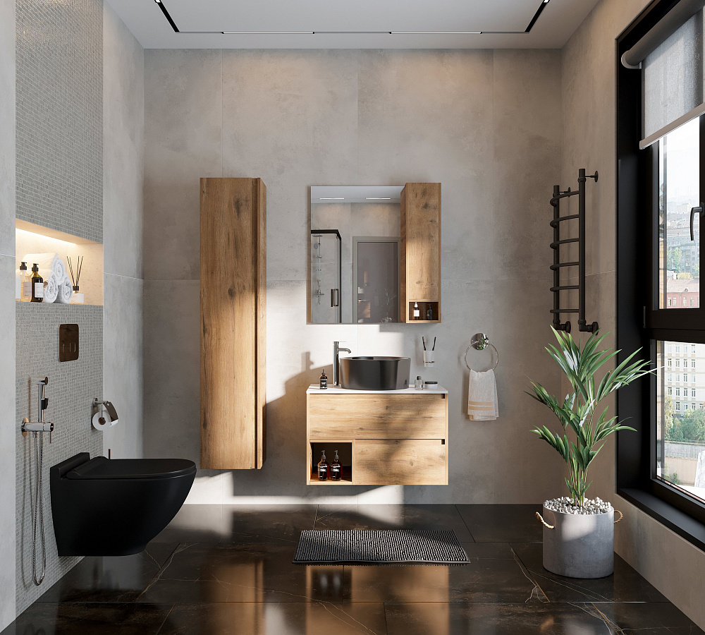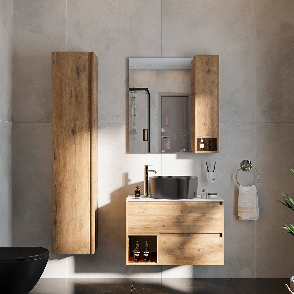 Мебель для ванной комнаты STWORKI Карлстад 75 дуб рустикальный, простоун беж, с раковиной на выбор