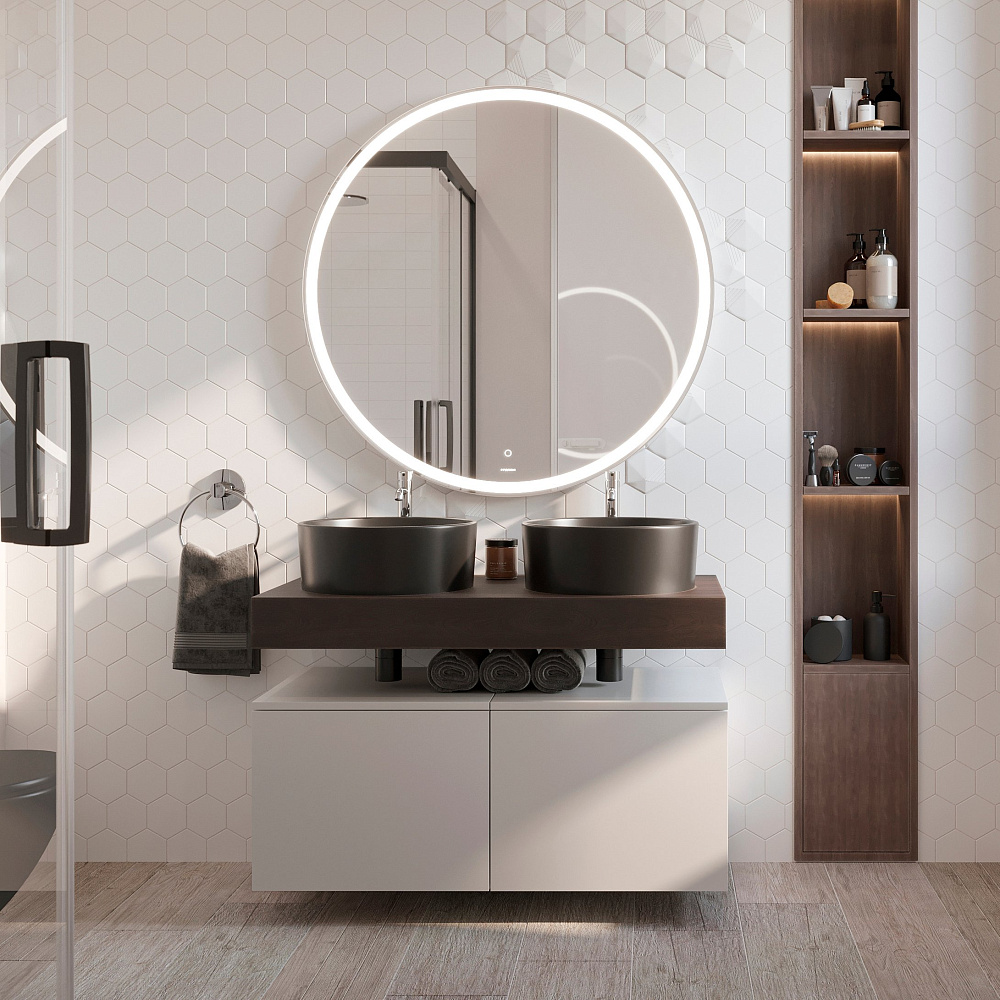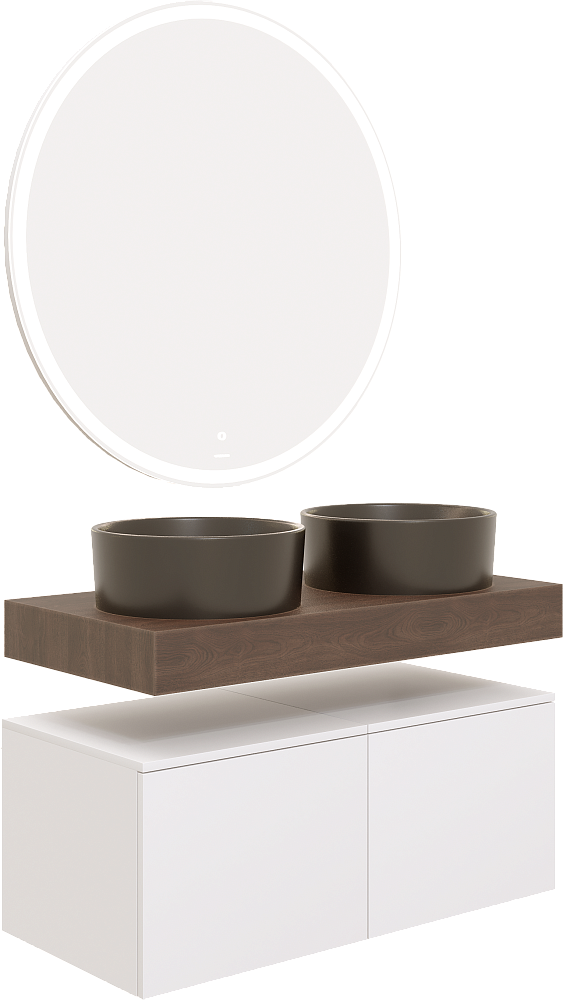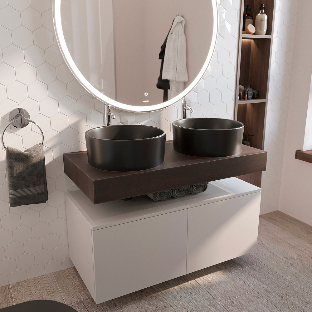 Мебель для ванной комнаты STWORKI Ольборг 100 столешница дуб карпентер, без отверстий, 2 тумбы 50 + 2 черные раковины