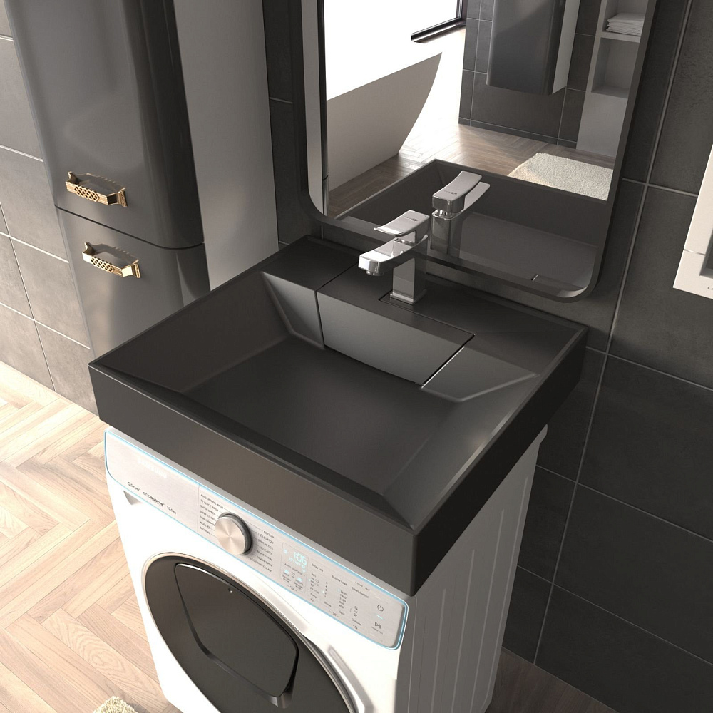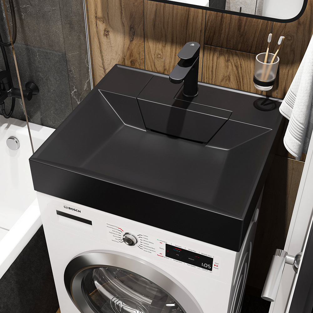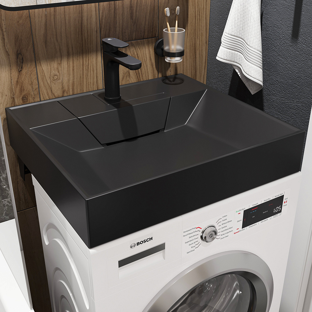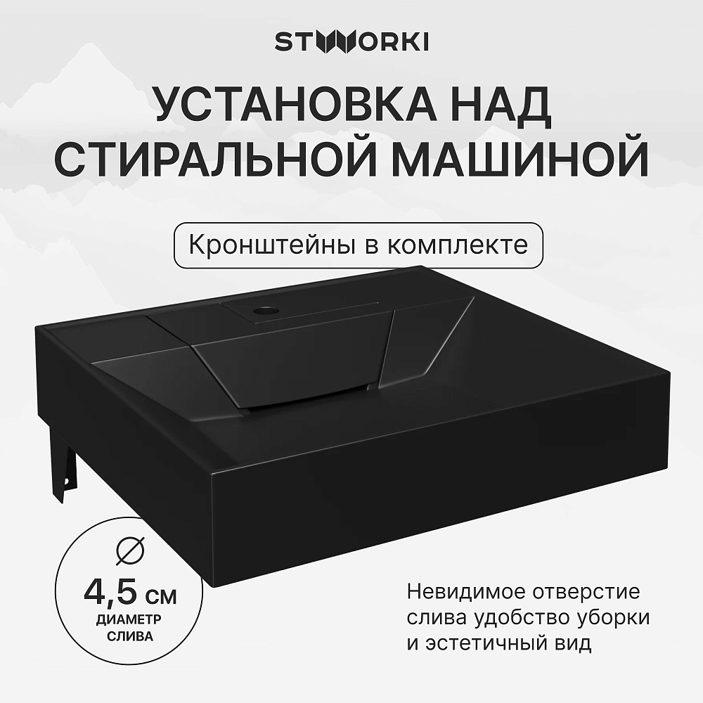 Раковина над стиральной машиной STWORKI Дублин 60x55 матовая черная, квадратная, литьевой мрамор, с комплектом кронштейнов