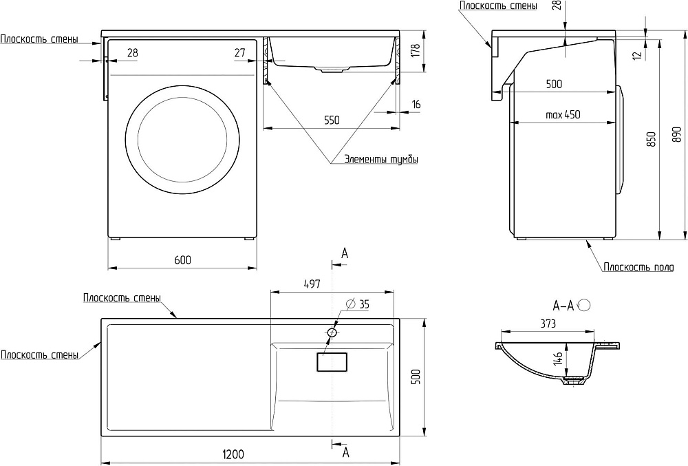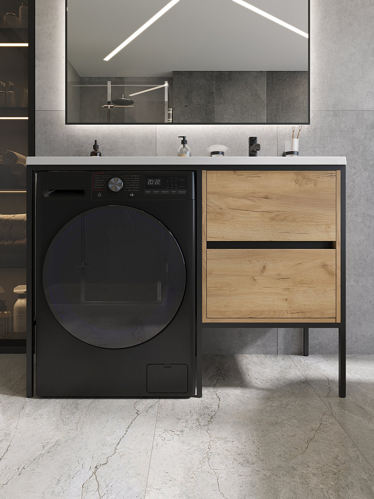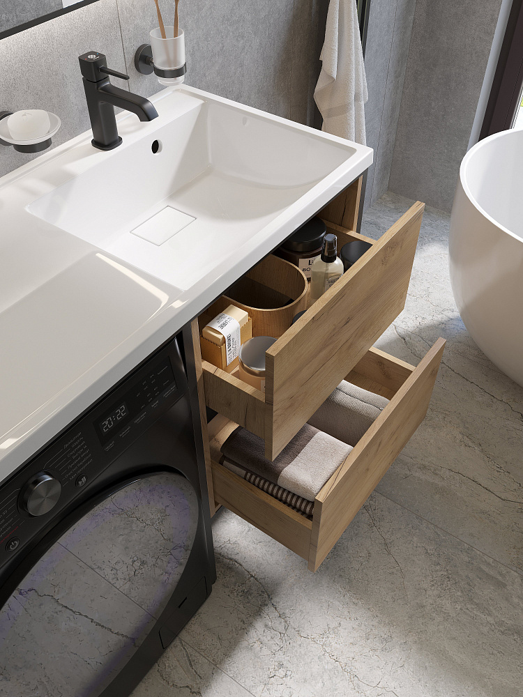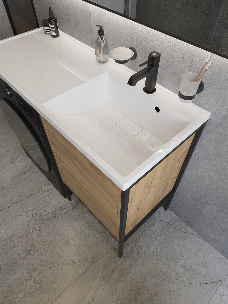 Раковина над стиральной машиной STWORKI Флом 120 R глянцевая белая, прямоугольная, литьевой мрамор, со столешницей слева, с кронштейном