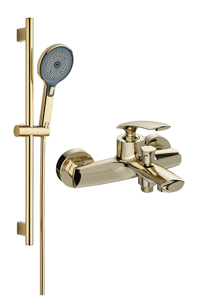 Смеситель для ванны с душем STWORKI Гётеборг S03100GG + Душевой гарнитур Гётеборг S03190GG, глянцевое золото