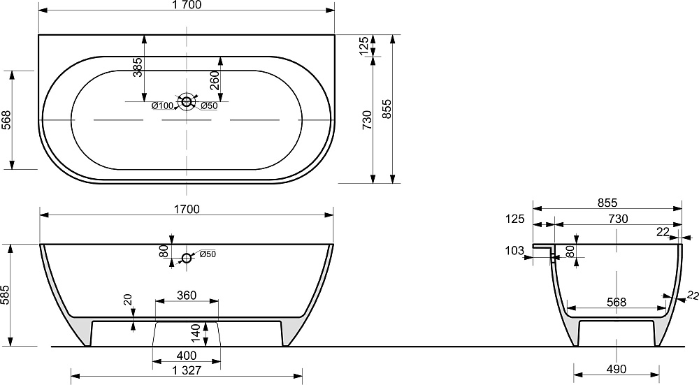 Ванна из искусственного камня STWORKI Левангер 170x85 см, пристенная, белая