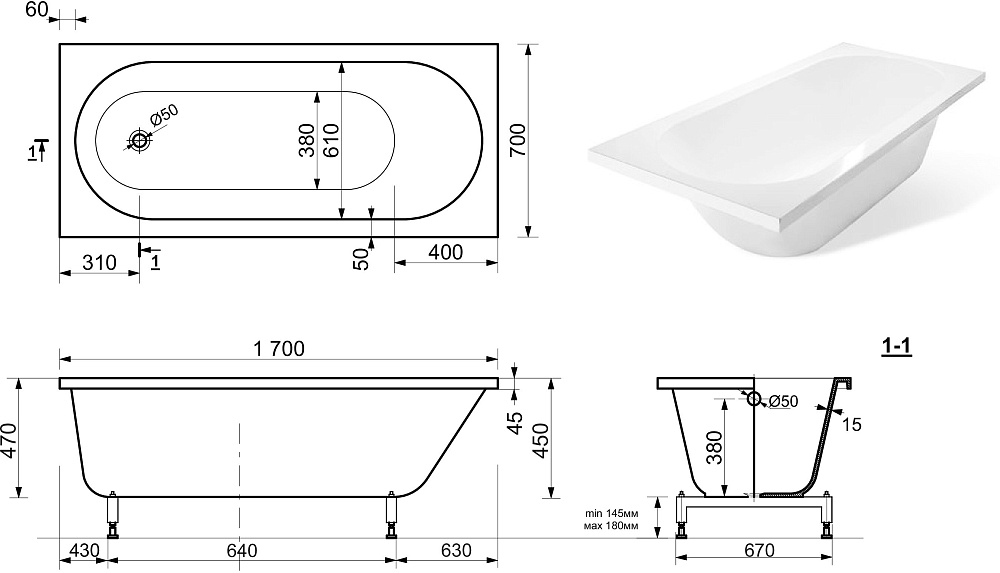 Ванна из искусственного камня STWORKI Олланд 170x70 см, пристенная, белая, на ножках