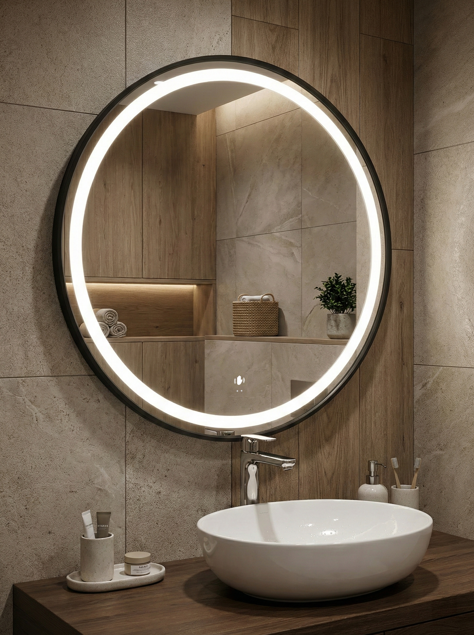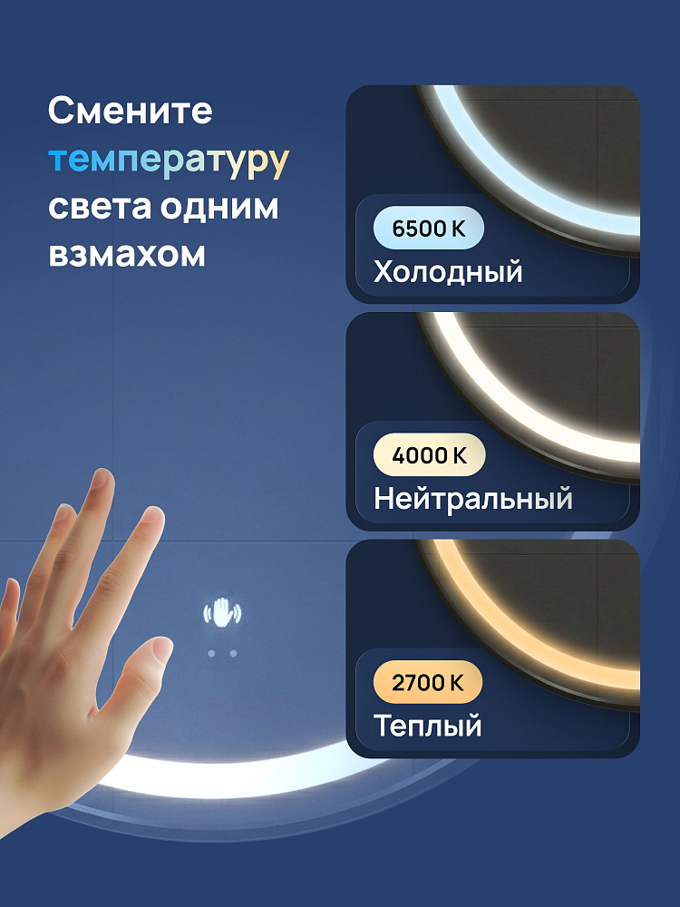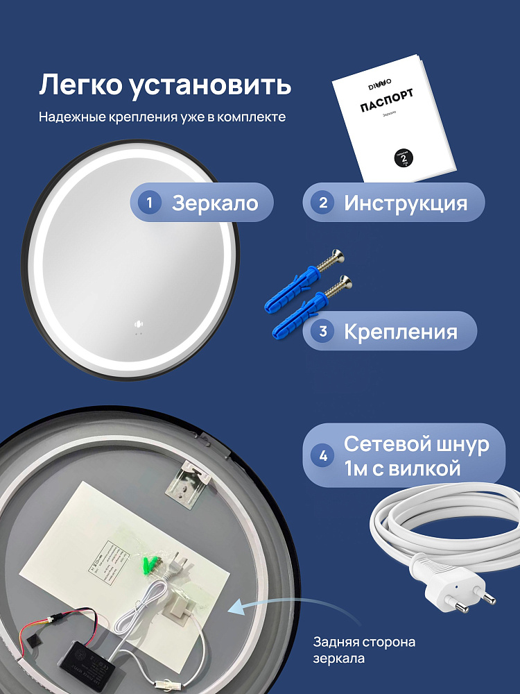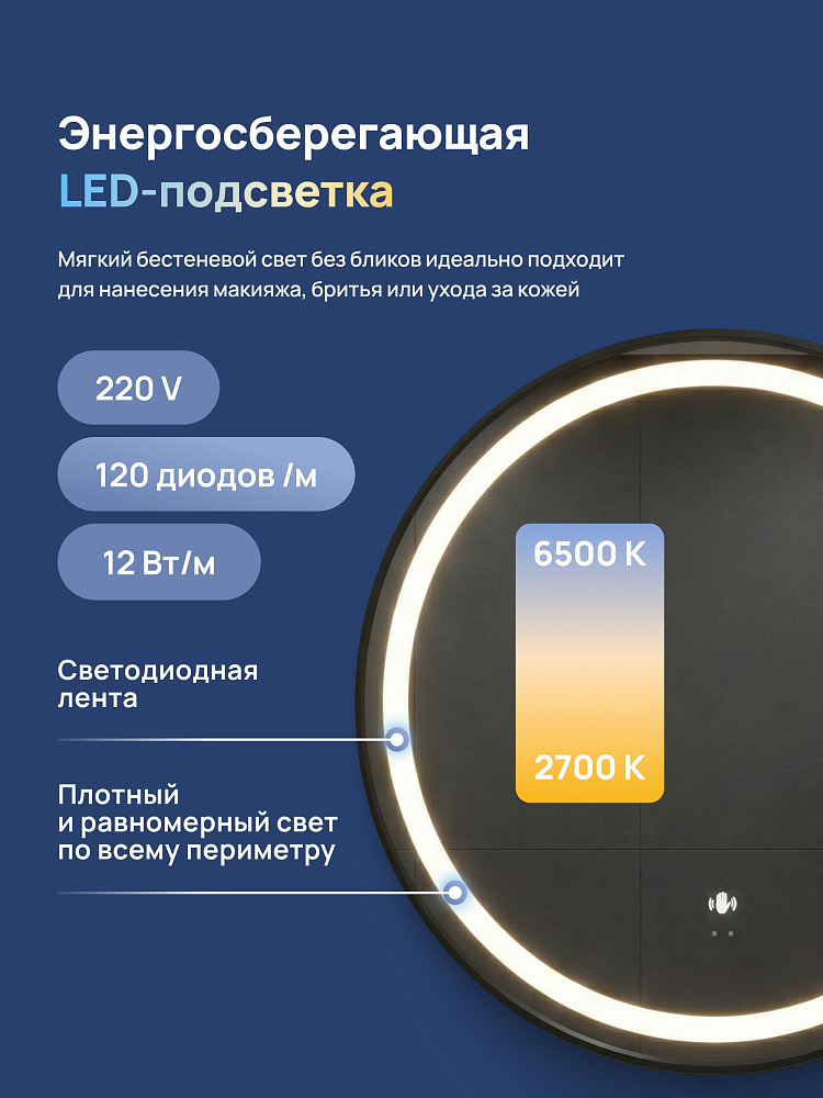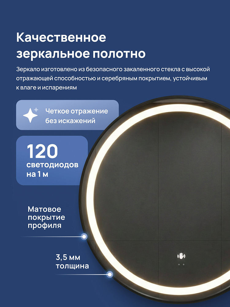 Зеркало круглое STWORKI Бурос 60, 3 цвета подсветки, с подогревом, матовое черное