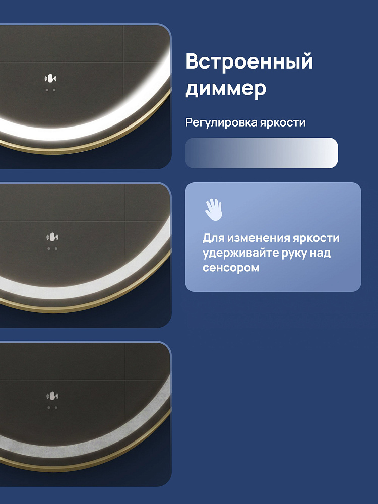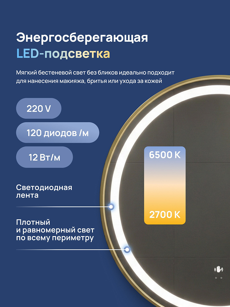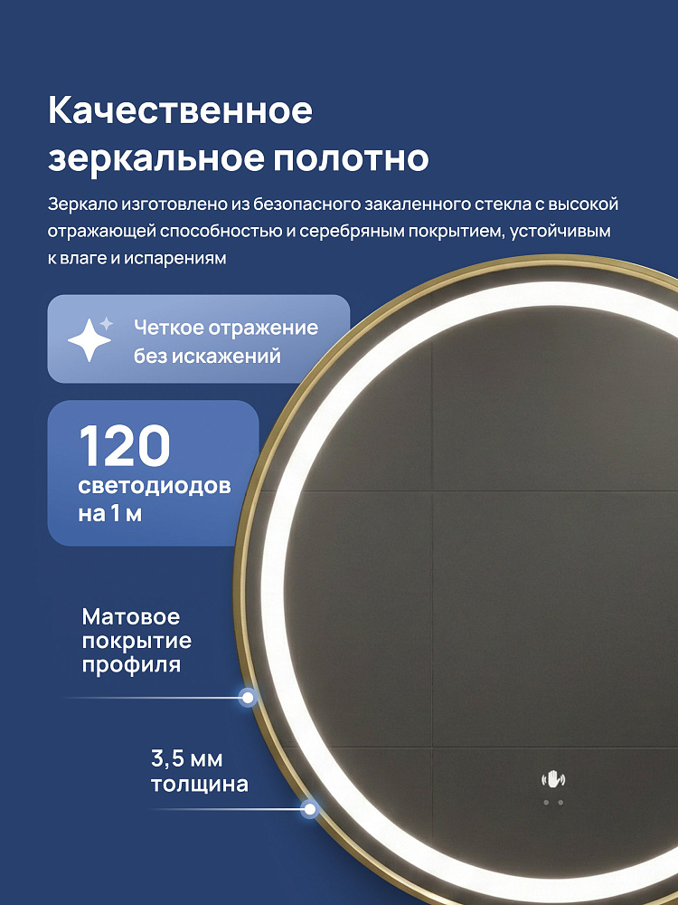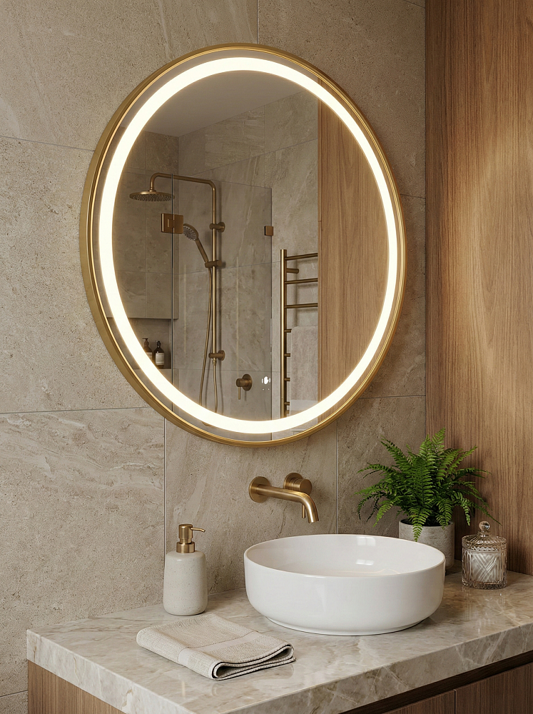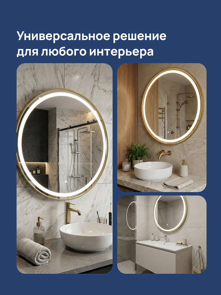 Зеркало круглое STWORKI Бурос 80, 3 цвета подсветки, с подогревом, матовое золото